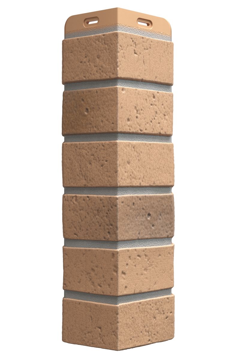Золотистый оттенок прекрасно передает эффекты и оттенки реальной текстуры кирпичной кладки. При обшивке фасада панелями и угловыми элементами одной цветовой гаммы вы получите точную имитацию классического каменного дома.